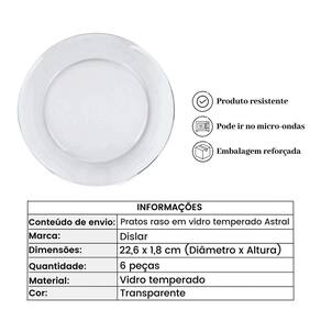 Super resistente o Jogo de pratos raso em vidro 6 peças 22,6cm Transparente vai super bem com qualquer tipo de decoração. Graças ao seu aspecto clássico que combina com tudo, ele vai ornar perfeitamente com os demais utensílios que você tem. Ele vai ser perfeito para usar no dia a dia ou quando for receber visitas em casa.Fabricado em vidro temperado de qualidade, ele apresenta uma excelente resistência e durabilidade.Itens inclusos;6 pratos raso em vidro temperado 22,6cm Astral TransparenteInformações Importantes;Medidas aproximadas - 22,6 x 1,8cm Diâmetro x Altura Composição - Vidro temperadoCor - TransparenteValidade - IndeterminadaConteúdo de envio - 1 unidade do Jogo de pratos raso em vidro 6 peças 22,6cm TransparenteFabricante - Nadir FigueiredoProduto 100% nacionalDURALEX é a linha de mesa que complementa o ambiente com harmonia. Uma linha tradicional e de confiança, que faz parte da história de seus consumidores. Os pratos, em vidro temperado, são resistentes a impactos e pequenas quedas. Pode ir ao micro-ondas, freezer, geladeira e lava-louças. A linha é composta por pratos, xícaras e saladeiras.Mais Informações;Evite pancadas ou impactos pois podem trincar, lascar ou danificar o produto.Ao lavar use de preferência detergente neutro, esponja macia e enxague com água em abundância, evitando o uso de abrasivos, como palha de aço ou saponáceo.Pode ser levado ao microondas.Pode ser levado ao freezer e geladeira.Pode ser levado a lava-louças.Evite riscá-lo com utensílios pontiagudos.Não coloque sobre a chama do fogão, em forno convencional ou outra fonte direta de calor.Uso em microondas somente para períodos curtos, para aquecimento.Não submeta à mudança brusca de temperatura. Jogo de pratos raso em vidro 6 peças 22,6cm Transparente