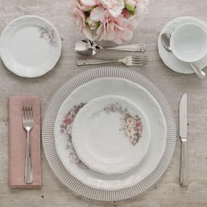 A delicadeza das rosas e a sutileza dos tons pásteis é o que define uma das decorações mais tradicionais da marca. O conjunto é composto por 12 pratos rasos com 26 cm.