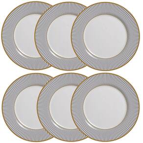 O Jogo de Pratos Rasos Ritz Preto, da Alleanza é um conjunto de seis peças que combina a funcionalidade com um design moderno, possui fundo branco e conta com acabamento geométrico em preto e branco, além de borda dourada. É ideal para compor sua mesa posta com elegância em ocasiões especiais, deixando o menu ainda mais atrativo. É uma peça sofisticada e charmosa, perfeito para servir carnes e outros alimentos e até mesmo servindo como apoio a pratos fundos. Produzido em Cerâmica Feldspática branca de alta resistência, com processo de decoração digital, sobre a base branca, é um produto não refratário, de uso seguro, pois não libera substâncias tóxicas. Conta ainda com acabamento acetinado, o que proporciona um toque fino e rústico na peça. Ideal para servir a família e os amigos de forma muito elegante! Informações básicas: Marca: Alleanza Referência: 1094-101 Características: Composição: Cerâmica Feldspática Medidas aprox. dos pratos (A x D): 2,7 x 29 cm Conteúdo da embalagem: 6 pratos rasos Especificações técnicas: Garantia: contra defeitos de fabricação