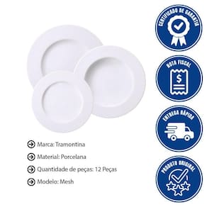 INFORMAÇÃO DOS PRATOS DE PORCELA TRAMONTINA 12 PEÇAS - Fabricado em Porcelana. - Coleção: Mesh. - Uso: Resistente a micro-ondas e lava-louças. - Porosidade próxima de zero, evitando a proliferação de fungos e bactérias. - Composto por: 12 peças. - Serviço: 4 pessoas.