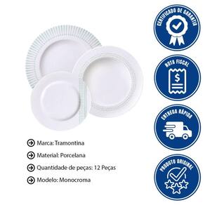 INFORMAÇÃO DOS PRATOS DE PORCELA TRAMONTINA 12 PEÇAS - Fabricado em Porcelana. - Coleção: Monocroma. - Uso: Resistente a micro-ondas e lava-louças. - Porosidade próxima de zero, evitando a proliferação de fungos e bactérias. - Composto por: 12 peças. - Serviço: 4 pessoas.