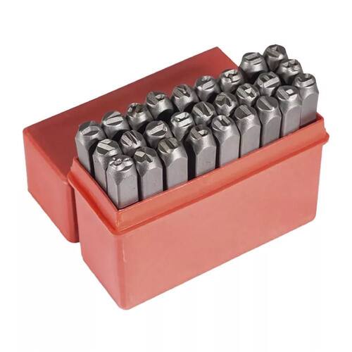 Aplicação: marcações e gravações. Apresentação: estojo plástico Modelo: Alfabético Com 27 Peças. Tamanho: 2,00mm. Material: Aço.