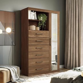 A Multi Cômoda conta com seis gavetas amplas para organizar todas suas roupas, possui quatro prateleiras, seis nichos e uma porta com espelho.