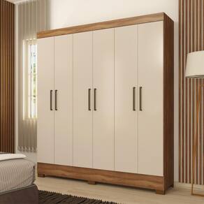 O guarda roupa se destaca pela configuração interna, oferecendo excelente distribuição com duas gavetas e diversas possibilidades para utilização das prateleiras e três cabideiros metálicos para roupas longas. Possui 6 portas e 2 gavetas internas, todas com corrediças telescópicas