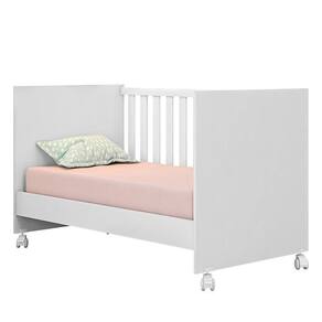 Berço Mini Cama Doce Sonho com Rodízio - Qmovi - Estrutura em MDP - Pintura UV atóxica - Padrão americano - Grades fixas - Estrado e travessas em MDF - Estrado regulado em 3 alturas: 1- 35cm, 2- 48cm, 3- 61cm - Acompanha suporte para mosquiteiro - Se transforma em mini cama - Certificado compulsório do INMETRO 007189/2017 - 4 Rodízios, sendo 2 com trava - Colchão recomendado 70x130cm - Não acompanha colchão