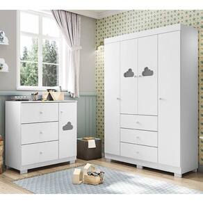 Guarda Roupa Infantil Ane 4 Portas e 3 Gavetas - Phoenix Baby Estrutura em MDF Pintura UV alto brilho 4 Portas Dobradiças metálicas 3 Gavetas Corrediças telescópicas Cabideiros Prateleiras Puxadores com formato bola Detalhes em acrílico nas portas formato nuvem Pés em polipropileno Amplo espaço interno