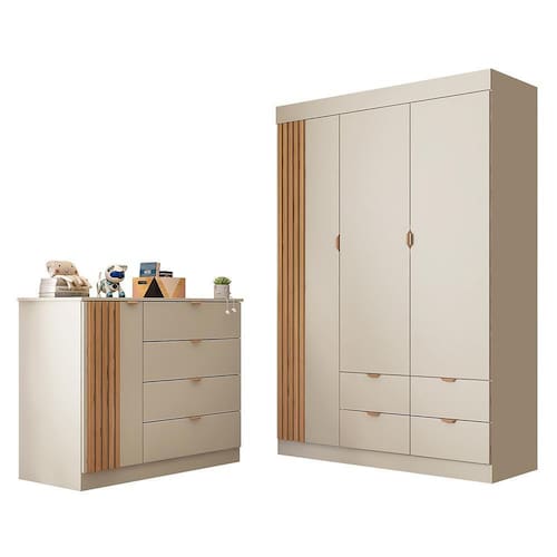 O Jogo de Quarto Infantil Ayla é composto pelo Guarda-Roupa e a Cômoda que combinam delicadeza e sofisticação em um design único, com detalhes em ripado que criam um ambiente sereno e encantador para o bebê. Feitos com estrutura resistente em MDF e acabamento em pintura UV, garantem durabilidade e beleza. Possuem múltiplas portas e gavetas com corrediças telescópicas para organização prática. Os elegantes puxadores na cor rosê gold adicionam um toque de requinte. Com amplo espaço interno e prateleira interna, oferecem funcionalidade e estilo ao ambiente do bebê.