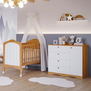 Jogo de Quarto Infantil Cômoda Encanto e Berço Harmonia - Permóbili Baby O Jogo de Quarto Infantil inclui a Cômoda Encanto e o Berço Harmonia. A Cômoda tem 4 gavetas amplas, uma porta com prateleira interna e cabideiro ajustável. Feita de 100% MDF, com bordas arredondadas e pintura atóxica, oferece resistência e durabilidade e os puxadores de plástico ABS completam o design. O Berço Harmonia é clássico e elegante, feito de MDF e certificado pelo INMETRO. Oferece segurança com duas regulagens de altura para o estrado, grades laterais fixas, 4 rodízios (2 com trava), bordas arredondadas com pintura atóxica, varão mosquiteiro e barra de proteção para transformá-lo em mini cama.