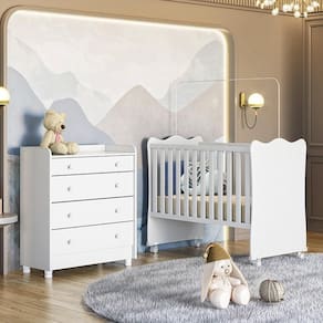 O Jogo de Quarto Infantil Doce Sonho é uma combinação perfeita de funcionalidade e fantasia. Composto por uma cômoda versátil com trocador e um berço clássico. A cômoda, eficiente para espaços reduzidos, inclui quatro gavetas e um trocador, além de com seu sistema antitombamento. Os puxadores em forma de estrela encantam o espaço, enquanto o berço, com design atemporal, oferece conforto e vem com suporte para mosquiteiro, assegurando proteção e serenidade para o sono do bebê.