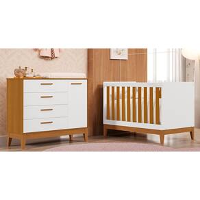 O Jogo de Quarto Infantil Flip foi pensado para oferecer praticidade, segurança e beleza ao ambiente do bebê. A cômoda é produzida em MDF com pintura UV atóxica, conta com 1 porta com dobradiças metálicas e prateleira móvel, 4 gavetas com corrediças telescópicas, puxadores revestidos, tampo com cantos arredondados, sistema antitombamento e pés de madeira. Já o berço americano, que se transforma em mini cama, possui estrutura em MDF com acabamento fosco, cabeceira arredondada, grade em madeira, 3 regulagens de altura no estrado, pés em madeira e certificado do INMETRO. Compatível com colchão de 70 x 130 cm (não incluso), é a escolha ideal para acompanhar cada fase do seu pequeno com conforto e estilo.