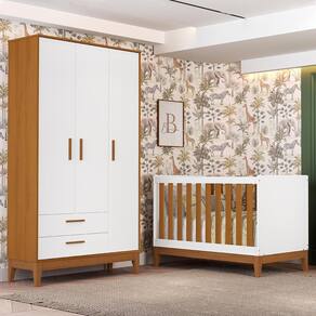 O Jogo de Quarto Infantil Flip oferece praticidade, qualidade e charme para o ambiente do bebê. O guarda-roupa é produzido em MDF com pintura UV atóxica, possui 3 portas com dobradiças metálicas, 2 gavetas com corrediças telescópicas, cabideiro em alumínio, prateleiras internas, puxadores revestidos e pés em madeira, garantindo organização e resistência. Já o berço americano, que se transforma em mini cama, conta com estrutura em MDF, acabamento fosco, cabeceira arredondada, grade em madeira, 3 regulagens de altura no estrado, pés em madeira e certificado do INMETRO. Compatível com colchão de 70 x 130 cm (não incluso), o conjunto é perfeito para acompanhar cada fase do crescimento do seu pequeno com conforto e segurança.