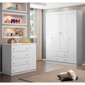 O Guarda Roupa infantil possui 4 portas, 2 gavetas com corrediças telescópicas, prateleiras e puxadores em PVC, com ótima divisão interna para guardar as roupas, toalhas, fraldas e brinquedos. Já a Cômoda Ellie conta com 1 porta, 4 gavetas com corrediças metálicas e 1 prateleira interna.
