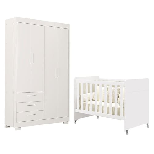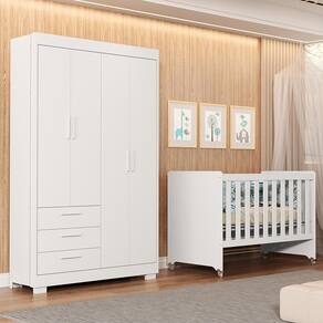 Um conjunto funcional e elegante, pensado para oferecer praticidade, conforto e segurança no quarto do bebê. O Guarda Roupa Infantil Zaki conta com 4 portas e 3 gavetas amplas, estrutura em MDF com pintura UV atóxica, corrediças telescópicas e puxadores em MDF. Possui cabideiro metálico e pés em PVC, garantindo resistência e durabilidade. O Berço Evolution 4 em 1 pode ser utilizado como mini berço, berço, sofá-cama e mini cama, acompanhando cada fase do crescimento da criança. Fabricado em MDF com pintura UV, possui 3 regulagens de altura do estrado, rodízios em gel (2 com trava e 2 sem trava) e é certificado pelo INMETRO, proporcionando praticidade e segurança.