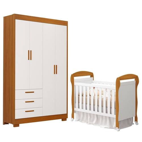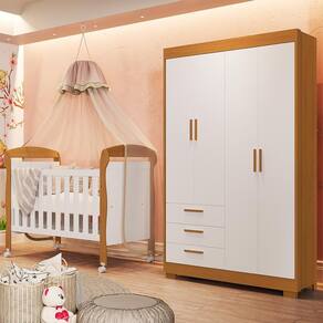 O Jogo de Quarto Infantil une dois móveis essenciais em um só conjunto: o guarda-roupa Zaki e o berço Danny. O guarda-roupa Zaki conta com estrutura em MDF e pintura UV atóxica, 4 portas, 3 gavetas com corrediças telescópicas, cabideiro metálico, puxadores em MDF e pés em PVC tudo para garantir durabilidade, praticidade e beleza. Já o berço Danny, com padrão americano, é versátil e seguro, possui grade fixa, 3 regulagens de altura do estrado, cantos arredondados, rodízios com trava, suporte para mosquiteiro e ainda se transforma em sofázinho. Certificado pelo INMETRO, oferece conforto e tranquilidade desde os primeiros dias de vida.