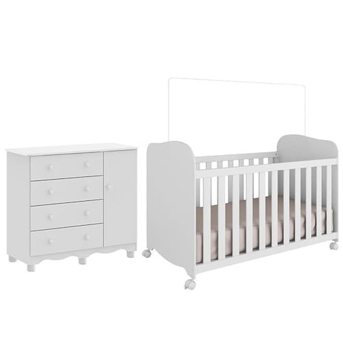 O Jogo de Quarto Infantil Júnior com Cômoda 1 Porta e Berço Uli oferece praticidade, segurança e ótimo aproveitamento de espaço para o dia a dia. A cômoda conta com 1 porta, cabideiro, prateleira interna e 4 gavetas com corrediças telescópicas. Produzida em MDF com pintura UV atóxica, possui puxadores em plástico, pés resistentes e duas opções de rodapé: usinado ou reto. O berço Uli segue o padrão americano, com 3 regulagens de altura do estrado, bordas arredondadas, grades fixas e rodízios, sendo dois com trava. Certificado pelo INMETRO, suporta até 40 kg e acompanha suporte para mosquiteiro. Recomendado para colchão 130 x 70 cm (não incluso). Um conjunto funcional e seguro, ideal para os primeiros anos do bebê.