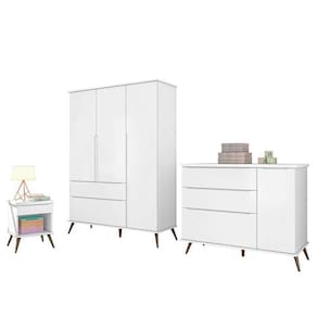 Jogo De Quarto Infantil Retrô Alice Guarda Roupa, Cômoda Com Porta E Mesinha Branco - Pr Baby Branco