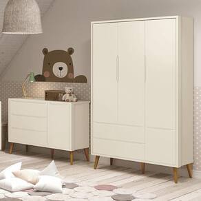 Jogo de Quarto Infantil Theo Retrô Guarda Roupa 3 Portas e Cômoda 1 Porta com Pés Amadeirado - Reller Móveis O Jogo de Quarto Theo Retrô é uma inspiração de épocas clássicas, uma releitura do estilo antigo nos tempos atuais, rejuvenescendo o ambiente com cores e formas. Seus pés pontiagudos realçam ainda mais essa proposta. Ele é composto por um Guarda-Roupa e uma Cômoda Theo Retrô de amplo espaço interno, perfeitos para a organização total do quartinho do bebê. Suas gavetas possuem corrediças telescópicas e seus puxadores são embutidos, agregando beleza e modernidade ao ambiente.