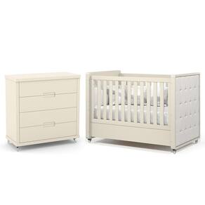 O Jogo de Quarto Infantil Tutto New é composto por uma cômoda e um berço com capitonê. A cômoda, feita 100% em MDF, conta com 4 gavetas com corrediças telescópicas, puxadores usinados e rodízios em gel (2 com trava), oferecendo ótimo espaço interno. Já o berço, também em MDF, possui certificação INMETRO, cantos arredondados, grades fixas, 3 regulagens de altura no estrado, rodízios com trava e pode ser transformado em mini cama. O capitonê em bouclê com espuma antichama dá um toque de elegância ao berço.