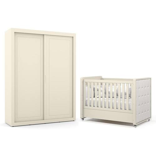 O Jogo de Quarto Infantil Tutto New oferece praticidade e elegância com um guarda-roupa e um berço com capitonê. O guarda-roupa possui 2 portas de correr, 4 gavetas internas com corrediças telescópicas, cabideiros em alumínio e amplo espaço interno, além de detalhes em baixo relevo nas portas. Já o berço, certificado pelo INMETRO, tem estrutura em MDF, grades fixas, 3 ajustes de altura no estrado, rodízios com trava e se transforma em mini cama. O capitonê em bouclê com espuma antichama adiciona um toque sofisticado ao berço.