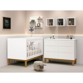 Indispensável para o quartinho do seu baby, o Jogo de Quarto Bebê Classic New - MóveisAqui, apresenta os pés em madeira maciça em um modelo que contribui para o ar retrô, todas as suas peças possuem um desing clean que se adequa a vários estilos de decoração. Contempla um Berço que transmite personalidade e delicadeza, podendo se transformar em mini cama futuramente, uma Cômoda com seis gavetas onde duas contém divisórias, para uma perfeita organização das roupinhas e itens do seu bebê. Além de um kit de nichos, que proporciona apoio e suporte dentro do quartinho, e também contribue para a exposição de objetos decorativos.