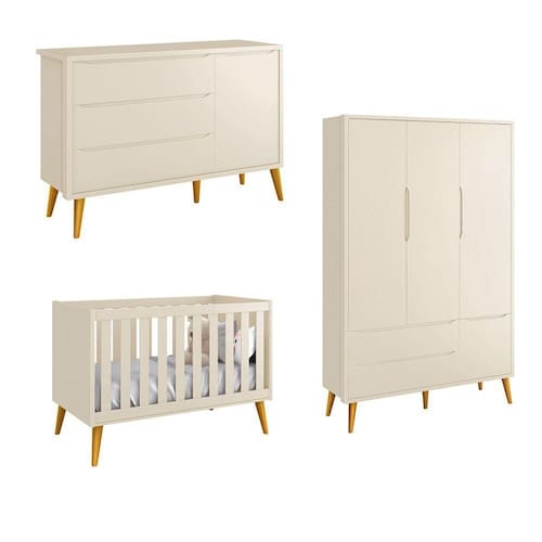 O Jogo de Quarto Bebê 3PTs Theo New - RELLER, é ideal para o quartinho do seu baby. Possui pés em madeira maciça no estilo palito que contribuem para o ar retrô, as peças detém de um desing clean que combinam com vários estilos de decoração. Contempla um Berço que exala personalidade e delicadeza, podendo trnasformar-se em mini cama futuramente, uma Cômoda Sapateira com três gavetas e uma porta, e um Roupeiro de três portas e duas gavetas, super amplos, espaçosos e com divisórias internas, são ideais para uma perfeita organização das roupinhas e itens do seu bebê.