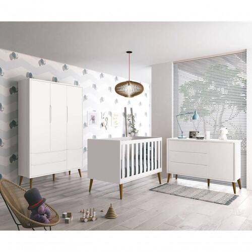 Jogo De Quarto Para Bebê Completo 3 Portas Théo New Branco Fosco Com Madeira - Moveisaqui