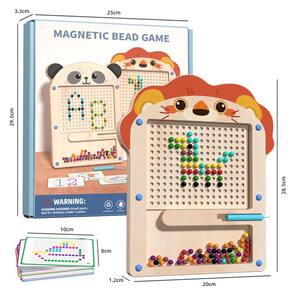 Especificação Material: Folheado de madeira de tília Cor: cores misturadas Tamanho do pacote: 29,5 x 25 x 3,3 cm Peso da embalagem: 0,5 kg Lista de embalagem: 1 x brinquedo educativo Este jogo magnético de quebra-cabeça com caneta e miçangas foi projetado para melhorar as habilidades motoras finas e a coordenação olho-mão em crianças pequenas. A caneta magnética ajuda as crianças a guiar as miçangas pelo caminho, tornando-a uma forma divertida e interativa de aprender. Feito de madeira de tília de alta qualidade, este brinquedo educacional é durável e ecológico. O acabamento não tóxico garante que seja seguro para crianças e, ao mesmo tempo, proporciona um uso duradouro, tornando-o ideal para brincadeiras diárias. O design com tema de leão adiciona um elemento envolvente para as crianças, tornando o aprendizado divertido e interativo. As cores brilhantes e o design divertido mantêm as crianças entretidas enquanto desenvolvem importantes habilidades cognitivas e motoras. Perfeito para a educação Montessori e o desenvolvimento da primeira infância, este jogo de quebra-cabeça magnético ajuda as crianças a melhorar sua concentração, habilidades de resolução de problemas e consciência espacial, tornando-o uma ótima ferramenta para o aprendizado pré-escolar. Compacto e fácil de guardar, este jogo de quebra-cabeça magnético é leve e portátil. É um ótimo brinquedo para usar em casa, nas salas de aula ou para aprender em qualquer lugar, oferecendo horas de diversão educacional e brincadeira.