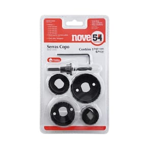 Jogo de Serra Copo com 06 peças. Fabricado em aço carbono ele é indicado para cortes em Madeira, Gesso e Plástico. Esse Kit de Serra Copo é composto por 06 peças, sendo 04 serras (32, 38, 44 e 54mm), 01 broca piloto para facilitar o corte oferecendo maior segurança e assertividade, acompanha também 01 chave Allen para instalação na furadeira.
