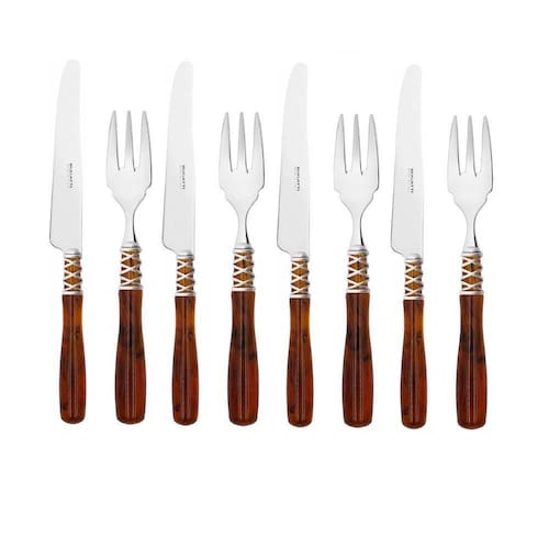 Os talheres não são apenas um acessório doméstico indispensável no dia-a-dia, mas também uma jóia preciosa capaz de decorar a sua mesa de forma única, tornando-a elegante ou contemporânea ao seu gosto.Os talheres não são apenas um acessório doméstico indispensável no dia-a-dia, mas também uma jóia preciosa capaz de decorar a sua mesa de forma única, tornando-a elegante ou contemporânea ao seu gosto.O jogo de sobremesa da Linha Arianna da Bugatti é composto por um anel cromado trançado inspirado no famoso fio de Ariadne que lhe dá o nome, e um elegante cabo de madrepérola em acrílico colorido.O cabo particularmente ergonômico e o equilíbrio perfeito de cada talher garantem uma experiência agradável à mesa e um manuseamento fácil.Pode ser lavada na lava-louças.Itens inclusos:4 Garfos para Sobremesa4 Facas para SobremesaMaterial: Aço inox 18/10Medidas:Garfo: A 20cm x L 3cmFaca: A 24cm x L 2cmPeso Total: 400gMarca: BugattiCor: TartarugaGarantia de 6 mesesSobre a Bugatti:A Bugatti é uma tradicional Marca Italiana, reconhecida mundialmente pelo alto design e qualidade dos seus produtos. A empresa se destaca pelo seu estilo único e inovador, combinando tecnologia com os valores da tradição artesanal e sua responsabilidade com a sustentabilidade ambiental.
