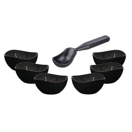 Conjunto de sobremesa com 6 potes bowl e colher de sorvete. As tigelas são fabricados em material plástico resistente. Colher em metal desenvolvida em alumínio moldado, sem emendas, o que proporciona mais resistência e precisão. A linha com acabamento colorido recebe pintura eletrostática, mais firme e uniforme, com brilho intenso. Processo de fabricação exclusivo que resulta em um item diferenciado. Pode ser levado à lava-louças.