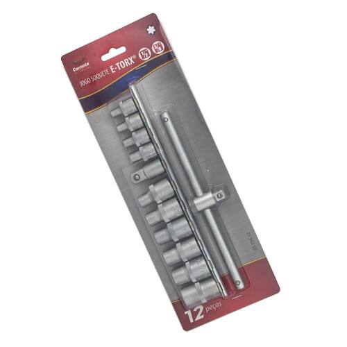 Jogo de soquetes com perfil torx fabricado em aço cromo vanádio com acabamento em cromo acetinado.