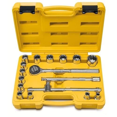 Soquetes e acessórios forjados em aço Cromo Vanádio.Acabamento Cromado.Composição: 14 soquetes estriados 1/2: 8, 10, 11, 12, 13, 14, 15, 16, 17, 19, 21, 22, 24, 30 mmCatraca reversível 1/2Cabo T 10Extensão 8Maleta plástica.A avaliação ;de dureza é realizada em vários pontos para assegurar a resistência ao desgaste da chave durante o ininterrupto. As aberturas das bocas das chaves de aperto são verificadas com gabaritos calibrados, o que garante seu perfeito acoplamento nos parafs. Alguns tipos de chaves de aperto são fornecidos em bitolas métricas e em polegadas, para o nos diversos fixadores disponíveis. As ferramentas são produzidas e testadas conforme normas específicas.