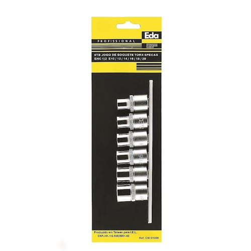 Jogo de soquetes torx fêmea, com encaixe de 1/2 polegada, em aço cromo vanádio de alta qualidade. kit com 6 peças, nas medidas: e10 / e12 / e14 / e16/ e18 e20.