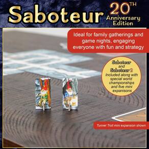 AMIGO Games Saboteur Edição de 20º aniversário – inclui cartas especiais, mini expansões e variantes para ainda mais aventura – Perfeito para noite de jogos em família – crianças adultos a partir de 8 - JOGO DE AVENTURA CLÁSSICA: Junte-se aos anões em sua busca por ouro enquanto sabotadores tentam frustrar seus esforços. Coloque cartas de caminho, explore minas e descubra um tesouro dourado. - EXPANSÕES: Jogo base Saboteur, expansão Saboteur 2, cartas de ação do Saboteur World Championships 2016-2023, mini expansões Tunnel Toll, Wardrobe Cavern, Tunnel Party, New Goals, & Treasure Chests. - ESTRATÉGIA E SECRECIMENTO: Bloqueie aqueles que você suspeita serem sabotadores enquanto mantém suas próprias intenções ocultas. Confiança é fundamental, mas apenas o ouro conta no final! - Perfeito para a noite de jogo em família: adequado para crianças a partir de 8 anos, tornando-o divertido para toda a família. Varia de 2 a 12 jogadores e oferece uma estimativa de 30 minutos de jogo emocionante. - O jogo inclui: Inclui 210 cartas, 1 cartão postal com 2 mini expansões, 1 placa perfurada com 2 anões e 33 pepitas de ouro, 1 folha de régua e 1 elástico para manter tudo junto.