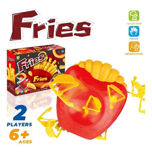 Jogabilidade: Cada jogador, na sua vez, coloca as batatas fritas. Quando as batatas fritas saltam para fora da mesa, o jogo termina e o jogador perde. Descrição do jogo: Retire as batatas fritas da embalagem, coloque a caixa de batatas fritas sobre a mesa e cada jogador, na sua vez, coloca uma batata frita as batatas fritas ficam presas como mostrado na imagem . Quando as batatas fritas quicarem, o jogador perde.