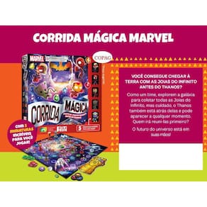Jogo corrida magica marvel Colete as joias do infinito antes do thanos Você consegue chegar á terra com as joias do infinito antes do thanos Como um time, explorem a galaxia para coletar todas as joias do infinito. Mas cuidado com o thanos, que poderá aparecer a qualquer momento. Ele tambem esta atrás das joias Quem ira reunir todas primeiro O futuro do universo esta em suas mãos Este jogo desenvolve -interação social -funções motoras -contagem numéricas Contem: 5 miniaturas personalizadas 1 tabuleiro 1 dado com 6 lados 1 berço contendo regras do jogo 6 joias verdes cartonadas 6 joias vermelhas cartonadas 8 fichas 1 luva do thanos cartonada Marca: copag Linha: marvel Modelo: corrida magica Quantidade de jogadores: 2 a 4 Idade recomendada: + 6 anos Som: não Luz: não Pilhas: não Imagens meramente ilustrativasHomologação Inmetro: IP-BRI-1432/2021-02