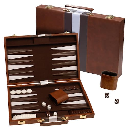 Conjunto de gamão de luxo - Jogo de tabuleiro de luxo: este jogo de tabuleiro clássico de gamão de luxo é o conjunto perfeito para jogadores iniciantes e avançados e também inclui tudo o que você precisa para jogar; perfeito para noites tranquilas, noites de jogos, festas em casa ou apenas diversão para adultos. - Exterior de couro, interior de feltro: o belo interior de feltro macio de qualidade com detalhes em couro sintético costurado de forma inteligente cria uma base silenciosa ao rolar os dados e uma superfície lisa ao mover as fichas durante o jogo - Incluído no conjunto de gamão: tabuleiro de gamão, fichas de gamão, dados de gamão, cubo duplo, agitadores de dados. Incluímos fichas sobressalentes e dados de cada cor