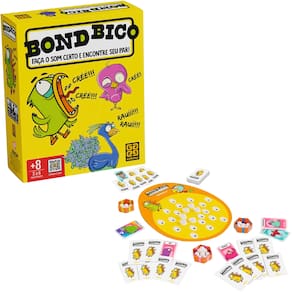 Descrição do produto : " Jogo Bond Bico - Grow A partida mais barulhenta e divertida da sua casa! Prepare-se para uma explosão de risadas com Bond Bico, o jogo onde todo mundo joga ao mesmo tempo e ninguém pode falar... só cantar como passarinho! Imite. Escute. Encontre. Ganhe! Cada jogador precisa imitar o canto das aves das suas cartas e, ao mesmo tempo, ficar de ouvidos atentos para encontrar quem está fazendo o mesmo som. Achou o par? Ganhou um ovo! Mas cuidado...\nTem passarinho que atrapalha tudo! • Papagaio que imita outros sons • Predador faminto pronto para atacar • Ladrão sorrateiro tentando roubar ovos • Pavão metido que quer chamar toda a atenção\nDiversão garantida para todos! Com partidas rápidas, muita interação e sons hilários, Bond Bico é ideal para reunir a família ou os amigos e transformar qualquer momento em uma festa cheia de confusão boa e gargalhadas.\nA partir de 8 anos De 3 a 6 jogadores Duração média: 20 minutos Contém cartas temáticas, ovos colecionáveis e instruções ilustradas Fechar\nComponentes 1 Tabuleiro,1 Baralho, 25 Bolinhas Brancas, 6 Cestas Cartonadas e 1 Regra : "