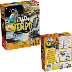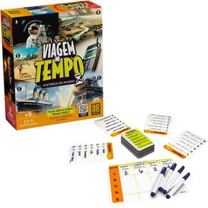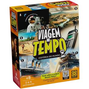 Descrição do produto : " Viagem no Tempo - História do mundo Nessa percepção de tempo nem sempre é o que parece, e no jogo Viagem no Tempo é com isso que vamos brincar. Cada carta traz seis eventos históricos que devem ser colocados na ordem cronológica do mais antigo para o mais recente. Cada posição acertada vale um ponto. Desafie seus amigos para descobrir quem sabe mais sobre a História do Mundo!\nIdade: A partir de 8 anos Participantes: ae 2 a 4 tempo estimado de jogo 25 minutos Fechar\nComponentes Contém 1 baralho, 4 cartelas, 4 canetas dry-eraser, 1 painel para pontuação e 1 regra. : "