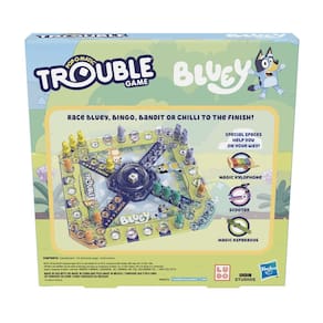 - JOGO DE PROBLEMAS COM TEMA BLUEY: As crianças podem imaginar uma aventura com Bluey e sua família! Esta edição do jogo Trouble é inspirada na popular série animada