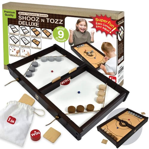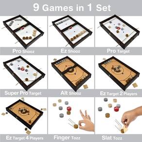 Vários jogos de tabuleiro para reunião familiar em todos os momentos Este tabuleiro reversível de mesa é perfeito para uma festa em família. Ele vem em um jogo de destreza rápido e um jogo de festa de boliche no gramado. Um conjunto é composto por 1 estação de jogo equipada com um portão de madeira removível, 12 discos de madeira, 4 ripas quadradas, 1 macaco vermelho, 2 barreiras de borracha, guia de jogo e uma bolsa de acessórios. Shooz: Um jogo de tiro em disco com velocidade relâmpago Shooz é um jogo de tiro rápido para crianças e adultos. Os jogadores usam o cordão elástico para lançar o disco através dos portões no lado oposto. Eles devem disparar discos o mais rápido que puderem sem se revezar e não podem empurrar discos para frente com os dedos ou mãos. O primeiro jogador que limpar todos os discos do seu lado ganha o jogo. Tozz: um popular jogo de boliche de gramado Tozz é um jogo de festa competitivo para amigos e familiares. O objetivo é colocar um disco o mais próximo possível do conector (um disco alvo) por uma variedade de ações sobre as regras: lançar, rolar ou piscar. Um jogador cujo disco mais próximo do macaco ganha a rodada. Vantagens Multi-jogos: jogo de destreza VS jogo tipo boules. Oferece 9 variedades de peças divertidas. Moldura de madeira maciça e peças de brinquedo. Agradável e durável. Jogo de longa duração. Ecológica. Produzido a partir de materiais ecológicos e não tóxicos. Regras fáceis. Capaz para membros da família de 2 a 4 jogadores. Sobre a IM A IM foi fundada desde 1987. Somos o fabricante de marcenaria na Tailândia. Empregamos tecnologia moderna e técnicas artesanais para atender à satisfação do cliente. Todos os produtos são projetados de forma criativa para garantir qualidade, segurança e beleza. - Vários jogos: um jogo de tabuleiro de madeira reversível oferece 9 variedades de jogos divertidos em um conjunto: 6 maneiras de jogar um jogo de destreza rápido e 3 maneiras de jogar um jogo popular tipo boules. Inclui 1 estação de jogo com um portão de madeira removível, 12 discos, 4 ripas quadradas, 1 macaco vermelho, 2 barreiras de borracha (não incluídas no Mini Shooz N Tozz), guia do jogo e uma bolsa para manter todos os acessórios juntos. - Compacto e portátil: Leve e compacto o suficiente para carregar. Pronto para jogar na mesa ou no chão. - Torneio ecológico: moldura de madeira maciça e peças de jogo de madeira. Ecológica. Agradável e durável. Jogo de longa duração. - DIVERSÃO EM FAMÍLIA: Para 2-4 jogadores, a partir de 14 anos. Regras fáceis. Capaz para membros da família. - Dimensões: 42,7 x 26,2 x 5,6 cm (C x L x A). >>>>> : ID de design registrado : 008036503-0002