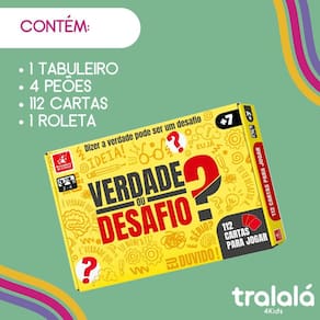 Jogo de Tabuleiro Infantil Perguntas Verdade ou Desafio Verdade ou Desafio é o jogo perfeito para tornar qualquer encontro entre amigos numa experiência inesquecível Simples, emocionante e cheio de surpresas, este clássico coloca os jogadores à prova ao escolherem entre responder a perguntas embaraçosas ou enfrentar desafios ousados e divertidos.