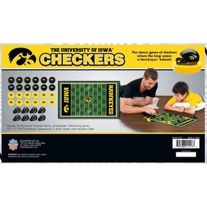 MasterPieces Jogo de tabuleiro NCAA Iowa Hawkeyes Checkers, 33 cm x 53 cm - Produto universitário oficialmente licenciado - O jogo inclui 24 peças de damas, 8 peças de capacete de futebol americano, tabuleiro de jogo de 33 x 53 cm, folha de adesivos e folha de instruções - Coroe seu xadrez king com um capacete Iowa que se encaixa firmemente no lugar - Dirija suas damas pelo campo de futebol em um tabuleiro de xadrez realista com zonas de extremidade coloridas do time