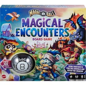 Jogo de tabuleiro Mattel Games Magic 8 Ball Magical Encounters para crianças, jogo cooperativo para famílias com Real Magic 8 Ball - O jogo da família Magic 8 Ball Magical Encounters se baseia no legado misterioso do brinquedo clássico e apresenta uma nova maneira de jogar. - 2 a 4 jogadores trabalham juntos para encontrar cristais e salvar o reino de um dragão furioso. - Os jogadores usam cartas de encontro para fazer escolhas, mas, no final das contas, a Magic 8 Ball decide seu destino. Eles obterão uma vantagem ou sofrerão um pequeno revés - vencerão ou perderão juntos. Este jogo de tabuleiro familiar cooperativo incentiva o trabalho em equipe em uma rica experiência de contar histórias. - Crianças e adultos vão adorar este jogo de estratégia fácil de aprender, onde os jogadores descobrem itens mágicos e encontram criaturas extravagantes. - Este jogo de tabuleiro de estratégia é um presente perfeito para qualquer noite de jogo em família.