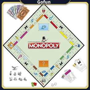 baús comunitários, 32 casas, 12 hotéis, 2 dados, pacote de dinheiro e guia do jogo