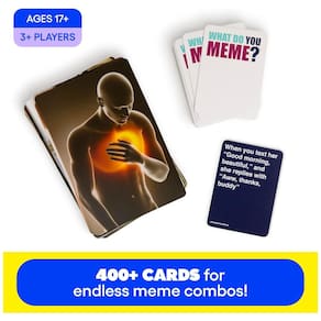 Como jogar Compita com seus amigos e familiares para criar os memes mais engraçados. Faça isso usando uma de suas cartas de legenda distribuídas para legendar a carta de foto em cada rodada. Escolha do Juiz O vencedor de cada rodada é decidido por um juiz rotativo. Dica profissional escolha seu cartão de legenda para combinar com o senso de humor do juiz. The OG Este é o jogo principal, então compre o primeiro. Você precisará dele para todos os nossos outros pacotes de expansão. Projetado para maiores de 17 anos este jogo contém conteúdo adulto e foi desenvolvido para maiores de 17 anos. Incentivado a ser jogado com 3 jogadores. Conteúdo Cada jogo principal do What Do You Meme contém 435 cartas. 360 deles são cartões de legenda e 75 são cartões de foto. Impresso em cartas de baralho premium espesso com acabamento brilhante inclui um cavalete e regras de bônus, embaladas em uma caixa personalizada. Mais hilaridade também fazemos outros jogos de festa inspirados na cultura pop. Confira nossa loja para toneladas de mais coisas boas Marca: Não Informado