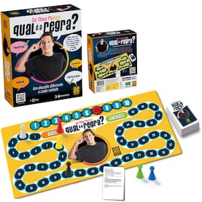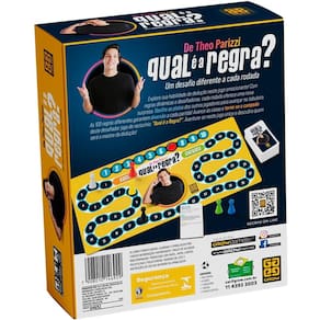 Descrição do produto : “Qual é a Regra?" desafia os jogadores a explorarem suas habilidades de dedução em uma atividade dinâmica e surpreendente. O jogo é inspirado na brincadeira criativa do influencer Theo Parizzi com sua família, na qual ele dá dicas através de palavras ou ações. Enquanto isso, os familiares tentam ganhar pontos descobrindo a característica comum entre as dicas ou a regra por trás delas. Em cada rodada do jogo, os participantes devem decifrar a regra específica da carta para avançar no tabuleiro. Com 100 regras diferentes, cada uma garantindo uma nova experiência, "Qual é a Regra?" promete muita diversão a cada rodada! Eu vou à Lua e vou levar um leão! Você não poderia levar um cachorro, mas poderia levar uma zebra! E aí, já sabe qual é a regra? :