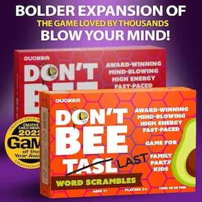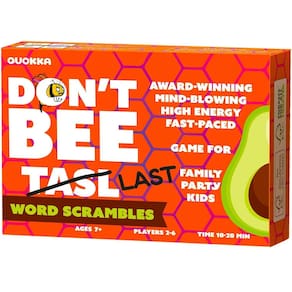 Apresentamos um jogo de festa emocionante e rápido que redefinirá sua experiência noturna de jogo – a sensação de mistura cerebral que certamente cativará jogadores de todas as idades. O objetivo é simples, mas envolvente: os jogadores se revezam colocando cartas e devem gritar a palavra correta. Cometa um erro, e está de volta ao começo. A corrida está prestes a ser a primeira a eliminar todas as suas cartas e reivindicar a vitória. Mas cuidado, porque se alguém colocar um cartão BEE no centro, todos devem bater rapidamente. A última pessoa a fazer isso é "picada" e deve adicionar toda a pilha à sua mão – as estacas são altas, então não dura! Projetado para aprendizado rápido, você pode estar pronto e funcionando em menos de um minuto, e cada rodada dura de 10 a 20 minutos gerenciáveis, garantindo horas de entretenimento. Com 72 cartas incluídas, o jogo acomoda de 2 a 15 jogadores, tornando-o perfeito para reuniões de amigos e familiares. - Edição SCRAMBLES: um complemento emocionante para o jogo de festa de ritmo acelerado que eletrizará sua próxima noite de jogo. Lute contra seus amigos e familiares se revezando colocando cartas e correndo para decifrar palavras corretamente em um segundo! - Bata na abelha: é melhor você prestar atenção, porque se uma pessoa coloca um cartão de abelha no centro da mesa, todo mundo tem que bater nela. A pessoa que der um tapa na última carta de abelha é "picada" e tem que adicionar toda a pilha à sua mão... não dura - Aprenda a jogar em menos de 1 minuto e jogar por horas. Cada rodada dura de 10 a 20 minutos. Este jogo de tabuleiro viciante fará você jogar rodada após rodada. Estraga as regras e comece de novo. Livre-se de todas as suas cartas primeiro para ganhar! - Este jogo foi projetado com todas as idades em mente. Se você tem 7 ou 87 anos, este jogo será incrível. O jogo contém 72 cartas, a quantidade perfeita para jogar com 2 a 6 pessoas. - Este é um presente perfeito para crianças e adultos. Este pode ser o único jogo que os pais continuam a jogar depois que seus filhos vão dormir