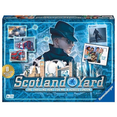 Ravensburger Scotland Yard - 27514 - Jogos de tabuleiro de estratégia familiar para crianças e adultos a partir de 8 anos - 2 a 6 jogadores - O conhecido jogo de esconde-esconde em torno do Mister X e dos detetives em Londres - diversão e jogos garantidos - Para 2-6 jogadores a partir de 8 anos, duração: 45 minutos - Scotland Yard tem que pegar Mister X antes que seja tarde demais, enquanto Mister X faz de tudo para escapar - Viaje de táxi, ônibus e bilhetes de metrô para perseguir Londres! Mas somente se vocês trabalharem bem juntos poderão pegar o Mister X! - Conteúdo: 1 tabuleiro de jogo, 6 bonecos de jogo, 29 cartas iniciais, 133 bilhetes, 5 tabuleiros de bilhetes, 1 tabuleiro de viagem, 1 viseira, instruções
