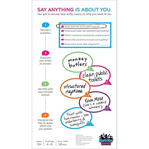. Jogo Premiado – Vencedor de mais de 30 prêmios! It's About You – Liberte o humor e a criatividade que você nunca soube que tinha! Perfeito para qualquer noite de jogo – Você pode decidir o quão espirituoso, estranho ou selvagem você quer ser. Fácil de Aprender – Você lê uma pergunta. Todos os outros escrevem uma resposta. Escolha secretamente sua resposta favorita. Então todo mundo tenta adivinhar qual você escolheu! Novas Perguntas – Esta Edição de 10º Aniversário tem 400 perguntas, incluindo 180 novas perguntas e as 220 perguntas mais populares do jogo .